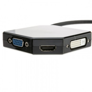 This 3-in1 DisplayPort Male to HDMI/VGA/DVI Female adapter allows you to connect a computer with DisplayPort output into a monitor or TV with HDMI, DVI or VGA input. Simply plug the Displayport Male end of this adapter into the Displayport output on your computer. You will then need a standard HDMI, DVI or VGA male to male cable to connect this adapter to your monitor or television. (HDMI, DVI and VGA cables sold separately). This adapter is unidirectional. It only works in one direction and will not provide any signal if you try to connect a HDMI, DVI or VGA device to a Displayport monitor. This adapter only allows one monitor to be connected at a time. It does not support multiple displays.