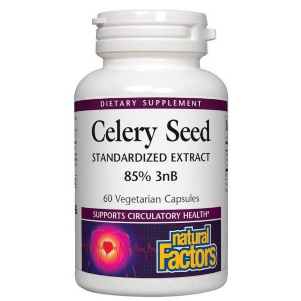 Celery Seed Extract from Natural Factors contains 85% 3-n-butylphthalide, or 3nB for short, a beneficial compound unique to celery and natural support for the circulatory system.85% 3-n-butylphthalide.Support for the circulatory system.75 mg per vegetarian capsule.Gluten Free, Vegan, Vegetarian, Non-GMO.Celery Seed Extract contains 85% 3-n-butylphthalide or 3nB for short - a beneficial compound unique to celery that provides support for healthy blood pressure already within the normal range.* One capsule provides the same level of 3nB as 4-6 ribs of celery.Rice powder gelatin capsule (gelatin purified water) cellulose magnesium stearate (vegetable grade) di-calcium phosphate silica. Contains no artificial preservatives or sweeteners; no corn dairy wheat or yeast.