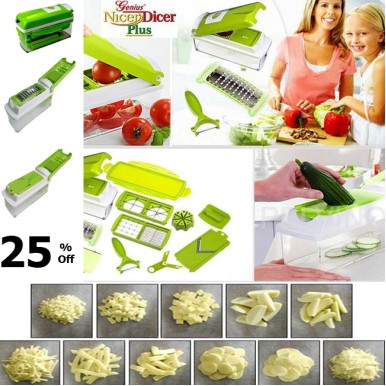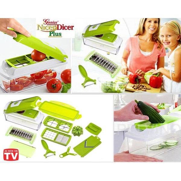 A good kitchen shoulderstand come equipped with good tools. And a good tool can come a long way in helping the cook save time and energy When preparing food. Nicer Dicer Plus, a multi-chopper toolthat is Suitable for the various preparation styles for fruits, vegetables, hard-boiled eggs, sausages, cheese, and more. Each blade gives you a choice of different cutting sizes: cut into segments of 4 or 8, cube food in 3 different sizes! There s even a grater and a mandolin slicer, perfect for slicing cucumbers proceed rapidly, carrots, and potatoes. Food preparation Has never been so simple! Fulfill all your kitchen needs with the help of one Nicer Dicer Plus instead of having to go through the hassle of using a variety of knives, bowls, cutting boards and! Nicer Dicer Plus kitchen partners: Nicer Dicer With Plus you have a kitchen helper, who will shorten the cooking time from start of preparation to the serving of the meal tremendously. Food must be cut into cubes, sticks, strips, quarters or eighths - the costs not only time but you need countless kitchen tools (knives, bowls, cutting boards, etc.) did can not always at hand and plenty of storage space in the kitchen to complete.Nicer Dicer with the Plus is no longer a problem - you have everything in one handy set! Simple and space saving as it gets! Nicer Dicer Plus takes the cutting convenience of Nicer Dicer and takes it to a whole new level. Boasting a huge 1,500 ml capacity, with Nicer Dicer Plus you can cut in 11 different ways. You can slice, dice, cut, julienne, cube, wedge, quarter, grate and so much more.It will shorten the cooking time from start of preparation to the serving of the meal tremendously. 5 different inserts with 11 different ways to cut: Cut into cubes or sticks in 3 different sizes Slices in 2 different thicknesses Cut in to quarters, eighths and wedges Long-lasting super-sharp stainless steel blades Extra sharp grater Mandolin slicer with safety food holder Package includes 1 cutting-top with integrated pin grid 1 cutting-base 1 transparent collector (capacity 1,500 ml) Cover for holding a fresh one collection container 1 blade assembly (6 mm x 6 mm or 12 mm x 12 mm) 1 blade assembly ( 6 mm x 36 mm or 18 mm x 18 mm) 1 knife used for quarters or eighths 1 plug-cutting punch for eighth 1 part-cover for all blade inserts 1 professional peeler The Nicer Dicer package comes with: 1 cutting-top with integrated pin grid 1 cutting-base 1 transparent collector (capacity 1,500 ml) Cover for holding a fresh collection container A blade assembly (6 mm x 6 mm or 12 mm x 12 mm) A blade assembly (6 mm x 36 mm or 18 mm x 18 mm) 1 knife used for quarters or eighths 1 plug-cutting punch for eighth 1 part-cover for all blade inserts 1 professional peeler User Manual