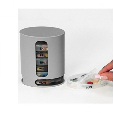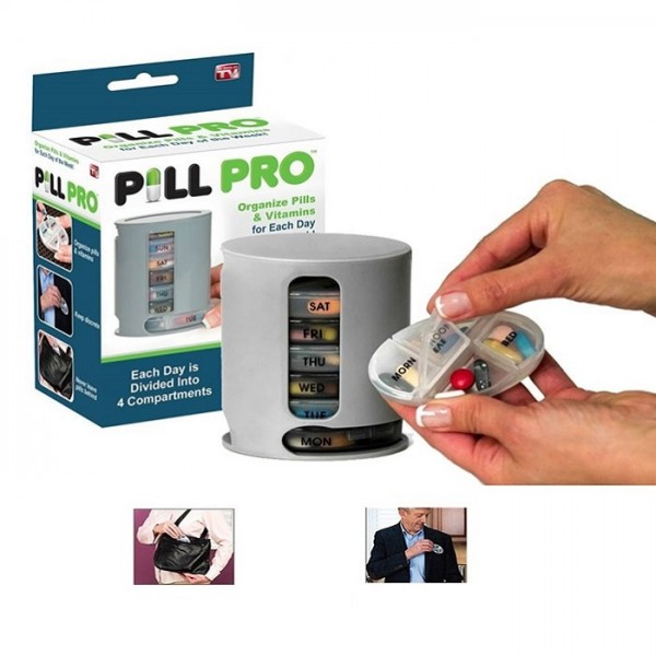 Pill Pro lets you conveniently organize your medicine and vitamins for each day of the week. Inside the Pill Pro are 7 portable trays, one for every day of the week. Plus, each day of the week is clearly marked and has four compartments for separating pills or organizing them by time of day. When you pull the day's tray out of the bottom of the Pill Pro, the next tray slides down into place. Simply refill Pill Pro by removing the top.