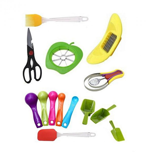 Package Include:1 x Apple Cutter1 x Vegetables Cutting Scissor1 x Melon Baller and Fruit Scoop 3pcs Set1 x Silicone Oil Brush1 x Silicone Spatula 1 x Measuring Spoon 5pcs Set1 x Ice Scoop 3 Pcs Set1 x Potato Chips Cutter